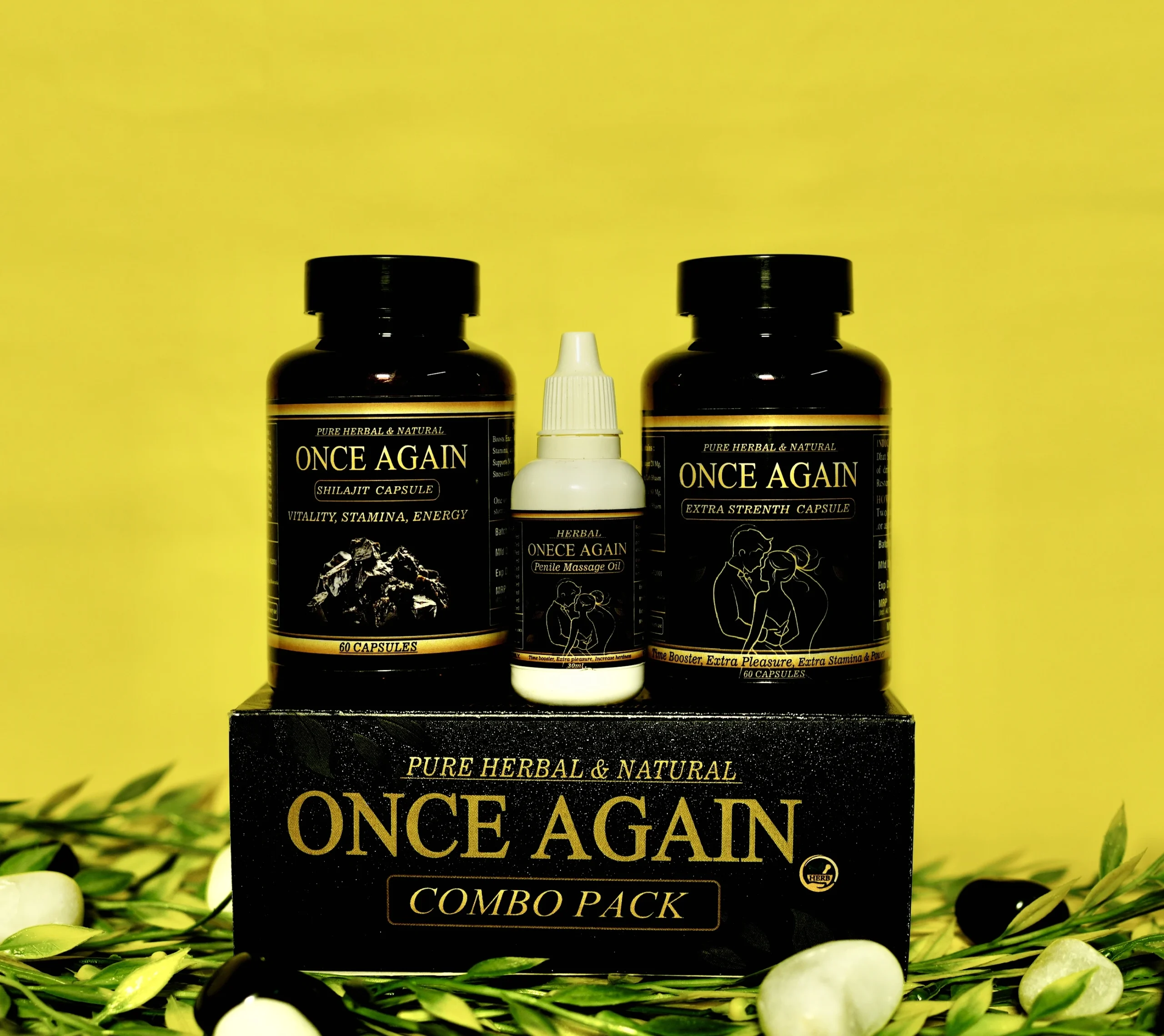 At Once Again, we harness the power of ancient Ayurvedic wisdom to help men regain energy, confidence, and performance—naturally. Our Shilajit and Extra Strength capsules, along with our potent Herbal Oil, are crafted to support stamina, vitality, and overall sexual wellness.